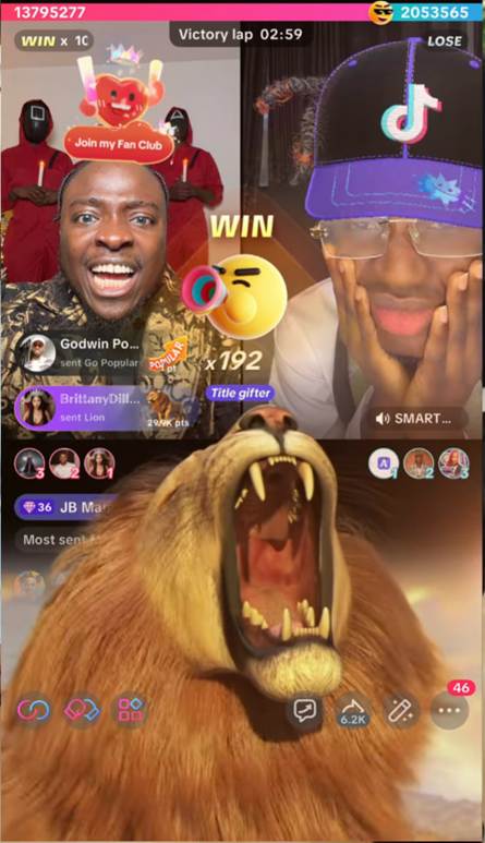 Ten format działa jak sportowa rywalizacja na żywo, gdzie widzowie czują, że ich decyzje mają realny wpływ na wynik. To napędza prezentowanie się na live i zwiększa ilość wysyłanych giftów. A sam host oczywiście w modelu TikTok – zarabia 30% giftów które otrzymują goście turnieju. To system wzajemnych korzyści – jego eventy są motorem napędowym wysokich wyników i maksymalizują dotarcie.